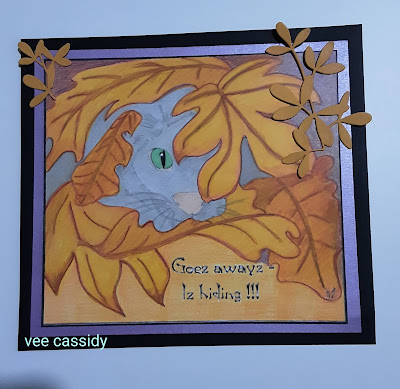 This is one of Ike's lovely digital stamps called Fall Kat it comes with the sentiment. I have coloured it with promarkers and prisma pencils. The layers are black and pearl purple card embellished with a Tim Holtz wildflower die cut.